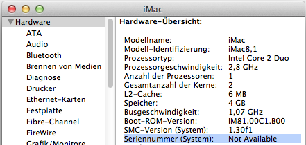 Unter “Über diesen Mac” – “Weitere Informationen” findet man (eigentlich) die Seriennummer. Bei mir steht dort “System Serial#” als Seriennummer drin. Ebenso wird im Systembericht die Seriennummer des Systems als “Not Available” angezeigt.
