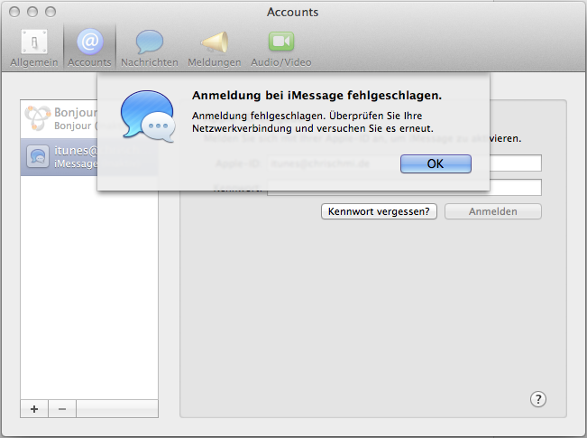 Seit einiger Zeit kann sich die Nachrichten App von Apple Mac OS X nicht mehr am Apple iMessage Service anmelden. Es kommt die irreführende Fehlermeldung: